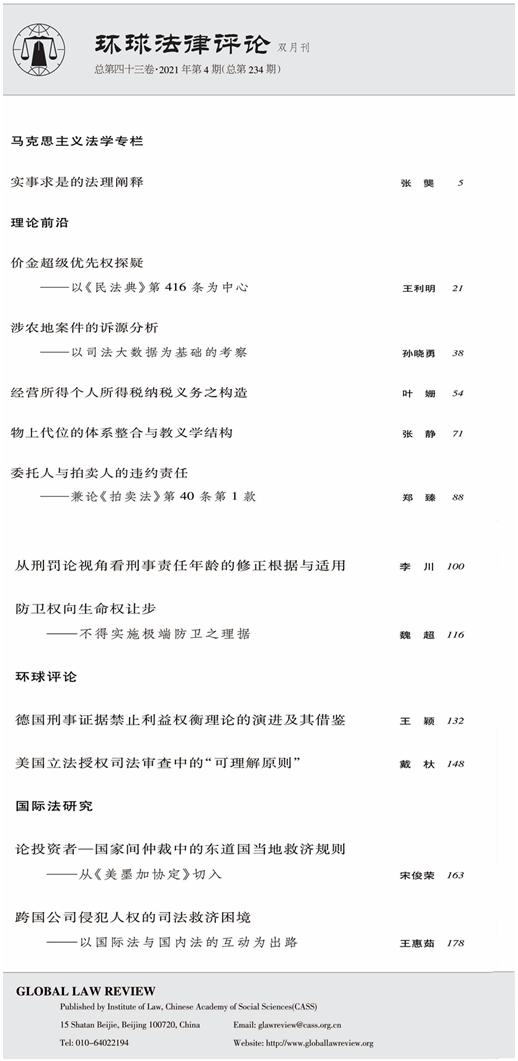 内容提要:作为正当防卫的指导原则,“权利无须向不法让步”在任何情况下均应当被遵守。不得防卫说剥夺了防卫人面对不法侵害时的防卫权,社会伦理限制说存在将道德与法律混为一谈的风险,自我答责并非正当防卫的正当化依据,故上述观点均难以成为不得实施极端防卫行为的理由。防卫权是国家合法垄断暴力背景下,赋予公民在紧急状态下侵犯他人以保护自身法益的法定权利,理应符合宪法的基本要求。根据保护义务与比例原则在“防卫人—国家—侵害人”三角关系中结合产生的“禁止过度原则”,侵害人在仅侵犯轻微法益时,宪法仍对其生命权具有保护义务,此时防卫人不得实施极端防卫行为的原因并非权利向不法让步,而是防卫权向生命权让步。