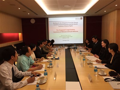 2015年8月16-20日,受新加坡律政部(Ministry of Law)邀请,国际法所所长陈泽宪率团一行6人出访新加坡。此次出访旨在对新加坡在保障依法独立行使审判权和保障司法公正等相关经验和问题进行考察,代表团成员还有法学研究所诉讼法研究室主任熊秋红、刑法研究室主任刘仁文、刑法研究室副主任樊文、江苏师范大学副教授刘瑞平,以及科研处项目官员聂秀时。
