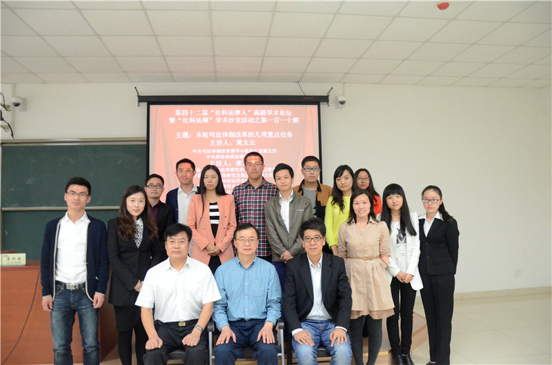 本次论坛的主题为"司法体制改革的几项重点任务",特别邀请到中央司法体制改革领导小组办公室副主任、中央政法委政法研究所所长黄太云担任主讲人。方志出版社社长、总编辑,中国社会科学院法学研究所研究员、法学系常务副主任,中国法学教育研究会副会长,中国律师行为研究会副会长冀祥德老师担任评议人。中国社会科学院法学研究所经济法研究室主任,中国社会科学院研究生院法学系副主任,北京市经济法学会副会长,中国银行法学研究会常务理事、学术委员,中国经济法学研究会理事席月民老师担任主持人。在校法学博士、法学硕士、法律硕士以及部分其他院系研究生近200人参加了此次讲座。
