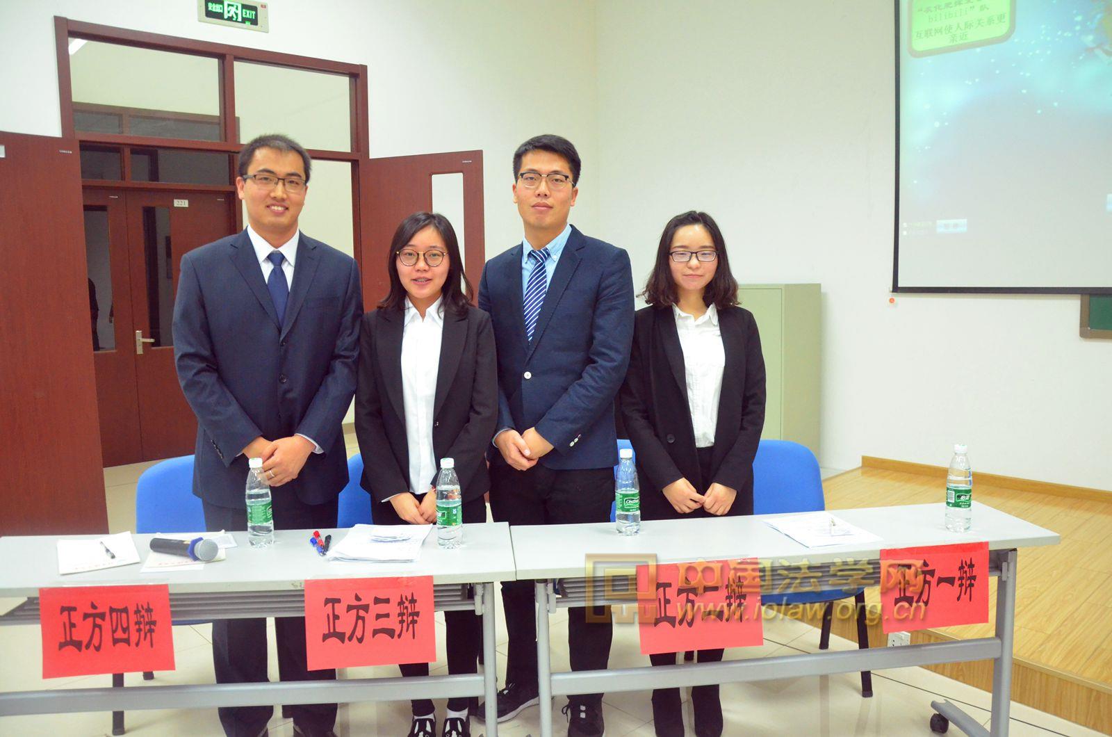 复赛第一场由韩梦超同学担任主席,在简要介绍辩题、比赛规则以及双方队员后,比赛开始。正方是由“中国法硕网”队的孙洁、余海赟、姚小敏、牛紫光四位同学组成,主张“网络文学有利于当代文学发展”。他们陈述了己方观点,分别从网络文学的定义,当代文学的定义,以及将来的发展方面进行阐述,并强调网络文学有利于当代文学发展。反方是由“枪与玫瑰”队的王天奇、陈靓漪、刘志远、符强四位同学组成,主张“网络文学不利于当代文学发展”。他们立足于网络文学不利于当代文学的发展的一些事实和客观情况来阐述本方观点,并通过对对方的关注的问题予以反击来加强己方观点。双方辩手赛场争雄,唇枪舌剑、你来我往,在阐释自己观点的同时也展示出了优秀的辩论技巧。