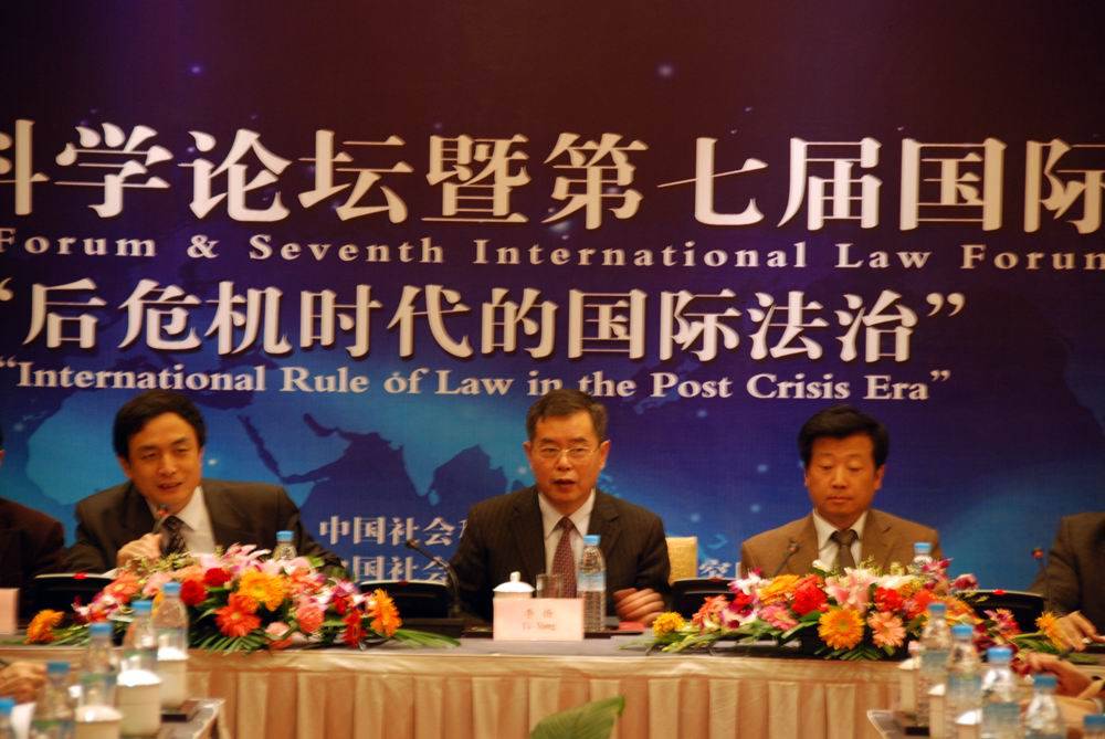 2010年11月20日至21日,中国社会科学论坛暨第七届国际法论坛•“后危机时代的国际法治”国际研讨会在北京成功举行。本届论坛由中国社会科学院主办、国际法研究所承办,着力探讨国际法治在全球金融危机将逝未逝、余波不休的复杂形势下所面临的重大问题,以及中国在此过程中的因应之道。中国社会科学院副院长李扬学部委员出席论坛并致开幕辞,来自最高人民法院、商务部、北京大学、清华大学、中国人民大学、中国政法大学、武汉大学、复旦大学、厦门大学、吉林大学、中山大学、上海交通大学、中南财经政法大学、浙江工商大学、外交学院、国际关系学院、上海社会科学院、德国马普比较私法与国际私法研究所、瑞典斯德哥尔摩大学、日本早稻田大学、韩国首尔大学以及法学研究所和国际法研究所等国内外高校、研究机构和实务部门的50余位专家学者参加了研讨。与会代表围绕国际人权法治、国家保护责任、海洋资源开发与海域联合执法、WTO法律制度、区域经贸一体化、人民币汇率、金融监管改革以及中国国际私法立法等议题进行了广泛、深入而富有成效的讨论。论坛在取得预期成果后,于11月21日圆满闭幕。