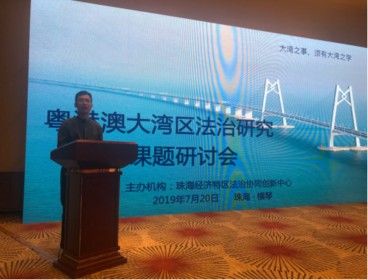 尊敬的冯主任,陈书记,贺主任,董教授,各位专家学者,还有各位朋友,非常高兴有这个机会来参加我们粤港澳大湾区法治研究课题研讨会,也非常感谢我们在座的各位专家学者和业界的朋友。今年2月份中央公布了《粤港澳大湾区发展规划纲要》,也为粤港澳大湾区法律服务融合发展提供了新契机,带来了新挑战。为了更好地将规划纲要所描绘的这种规划有效地转化为施工图,落实于实践,珠海市人大常委会等四家单位共同成立了“珠海经济特区法制协同创新中心”。就从中心的名字上来理解,我们觉得这个中心的特点就是它凸显法治,凸显协同,凸显创新。今天我结合这三个关键词,来谈一谈我们对中心应该聚焦研究的三个方面的一些初步的思考。