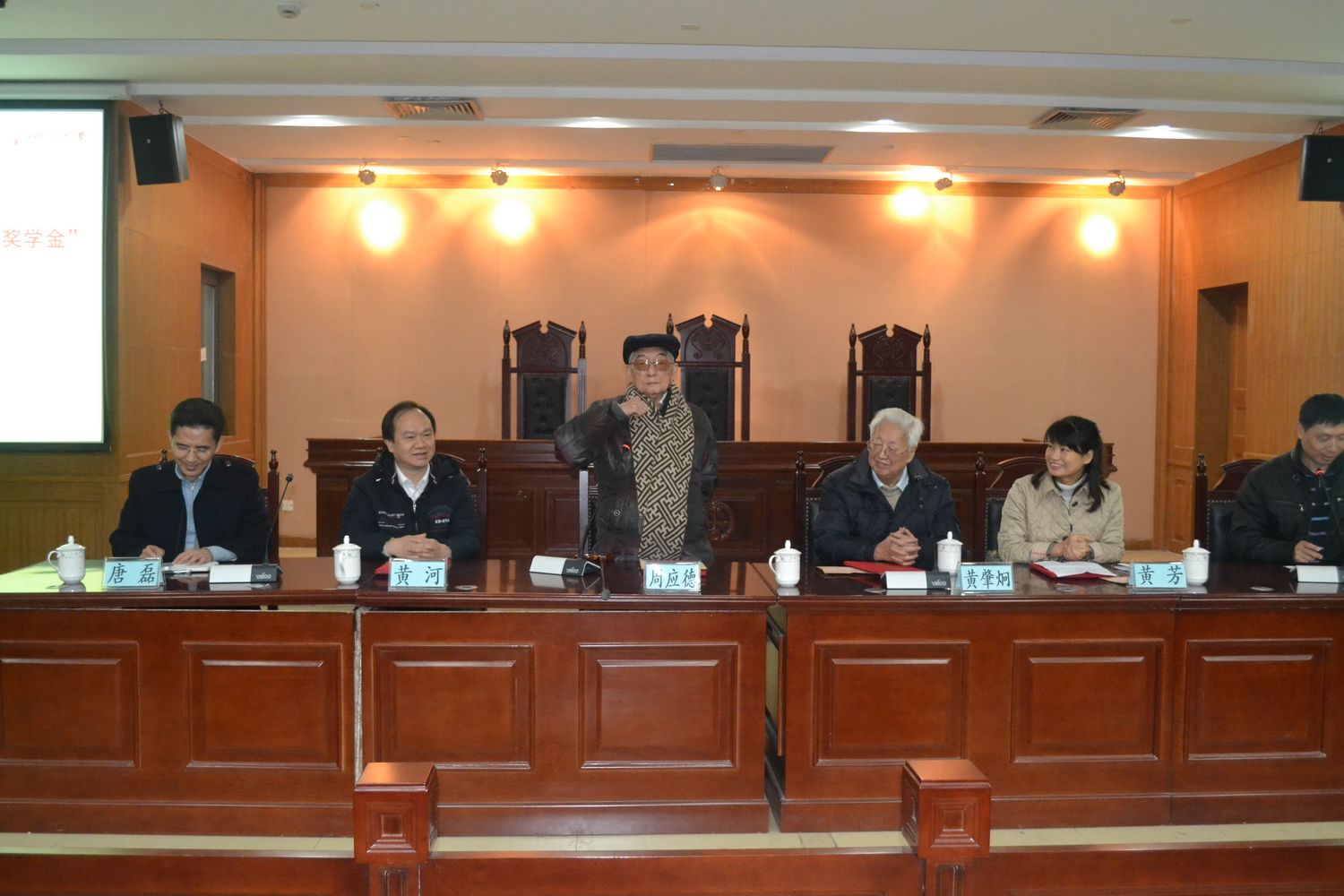 颁奖仪式正式开始,院长唐磊教授首先对周应德、黄肇炯两位老教授的出席表示诚挚的感谢并祝福两位耄耋老人身体健康,同时对 “法学英才奖学金”的两位设立者、杰出校友黄河副厅长和黄芳研究员表示感谢。唐院长说“法学英才奖学金的设立”对于弘扬学院优良传统,鼓励和支持优秀法学学子的成长有重要的意义,该奖学金的设立也表现了杰出校友对学院发展的关心和关注。