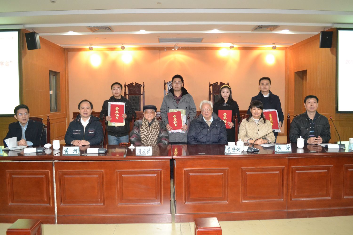 院党委书记古立峰教授宣布了2013年“周应德黄肇炯法学英才奖学金”的获奖名单,颁奖嘉宾向刘帅、袁泽瑜、洪凌啸、陈亮四名获奖同学颁发了证书和奖金并合影留念。2011级刑事诉讼法专业刘帅同学代表获奖学生发言。