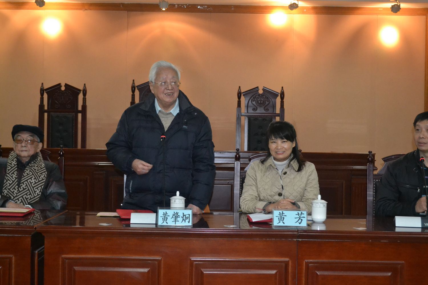随后,周应德教授和黄肇炯教授讲话。周应德教授已经九十多岁高龄,老教授思维清晰的介绍了学术历程和学术生活,并鼓励在座的学子们继续努力学习。黄肇炯教授也表达了对学生们的殷切希望,他勉励同学们努力学习早日成才,能像两位杰出校友一样尊重师长,反哺学院,贡献社会。