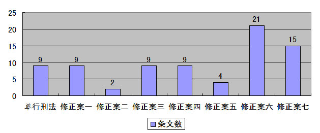 再以修订刑法的条文数为统计指标,可将一个单行刑法和七个刑法修正案图示如下:[7]