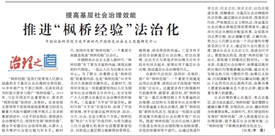 “枫桥经验”是我们党带领人民群众创造的关于基层社会治理的宝贵经验,50多年前产生于浙江枫桥,毛泽东同志当时批示要学习推广“枫桥经验”。2013年,习近平同志作出重要指示,要求把“枫桥经验”坚持好、发展好。在省部级主要领导干部坚持底线思维着力防范化解重大风险专题研讨班开班式上发表的重要讲话中,习近平同志指出,要推进社会治理现代化,坚持和发展“枫桥经验”,健全平安建设社会协同机制,从源头上提升维护社会稳定能力和水平。新时代,坚持和发展“枫桥经验”,一个重要方面就是推进“枫桥经验”法治化。