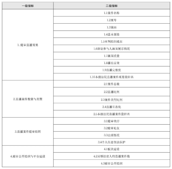 本次庭审公开第三方评估指标共分为两级,其中一级指标4个,分别是庭审直播效果、直播案件数量与类型、直播案件庭审组织、庭审公开组织与平台建设。二级指标22个。与上一年度的评估相比,少了对各级各地法院庭审公开组织管理相关工作的评估,但更强调庭审公开效果的客观呈现。